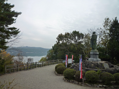 畔より池を見つめる大師像。同じ方向を向いて、ご詠歌をお唱えしました。