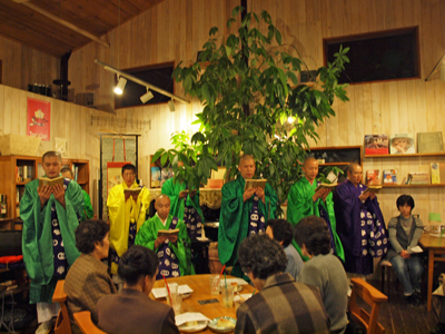 つぐみさんでライブをさせて頂くのは、これで3回目。今年1月の初ライブ、3月の2本立ての追加公演と、毎回大勢の方々がご参加くださり、お蔭さまで大変ご好評を頂いております。その活動が噂を呼んで、7月には伊賀市文化会館でも声明コンサートを開催いたしました。今年1年だけで、のべ400人以上の方に私たちの声明を聞いて頂いたことになります。とても大きな反響を頂き、メンバー一同、篤く感謝しております。