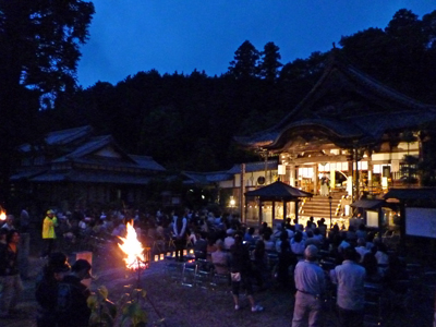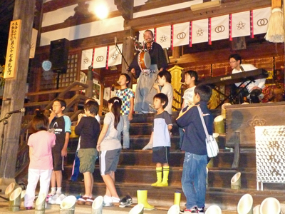本堂前に聴衆が座ります。ゆっくり濃くなる夕闇。風情があります。