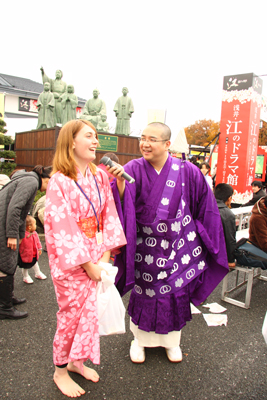 説戒師である私の仕事姿。火渡りを終えた外国女性に、笑顔でインタビュー。