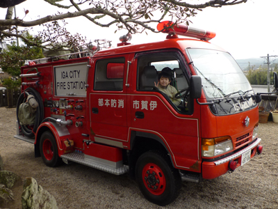 写真2: 消防訓練に参加したご褒美に、消防車に乗せて貰った息子。