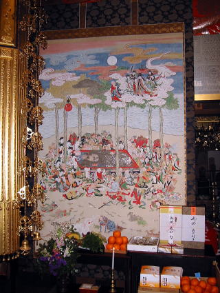 常福寺の涅槃図は、タタミ3畳分にもなるとても大きな掛軸です。これを本堂に荘厳して、ご詠歌の講員さん達と一緒に涅槃会を行います。