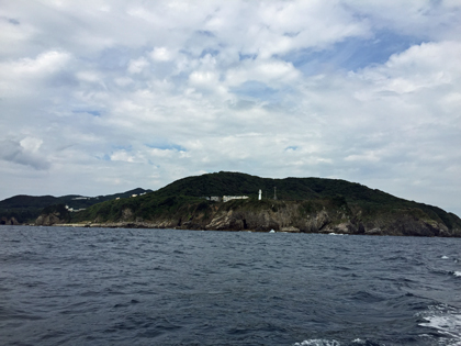 これは、なかなか体験できることじゃありませんよ! 海から陸地を眺めてみると、波濤で切り立った岸壁の上に、金剛福寺さまや宿泊したホテル、灯台などを遠くに望めました。