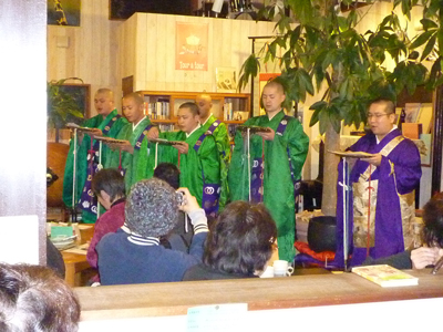 しかし、そこは確かな実力をもった仲間たち。緊張感に包まれながらも、見事な声明を響かせてくれました。ライブ自体は、声明を中心にしつつ、読経あり、御詠歌あり。楽器も、太鼓や吹螺・錫杖などを用いた本格的なものとなりました。